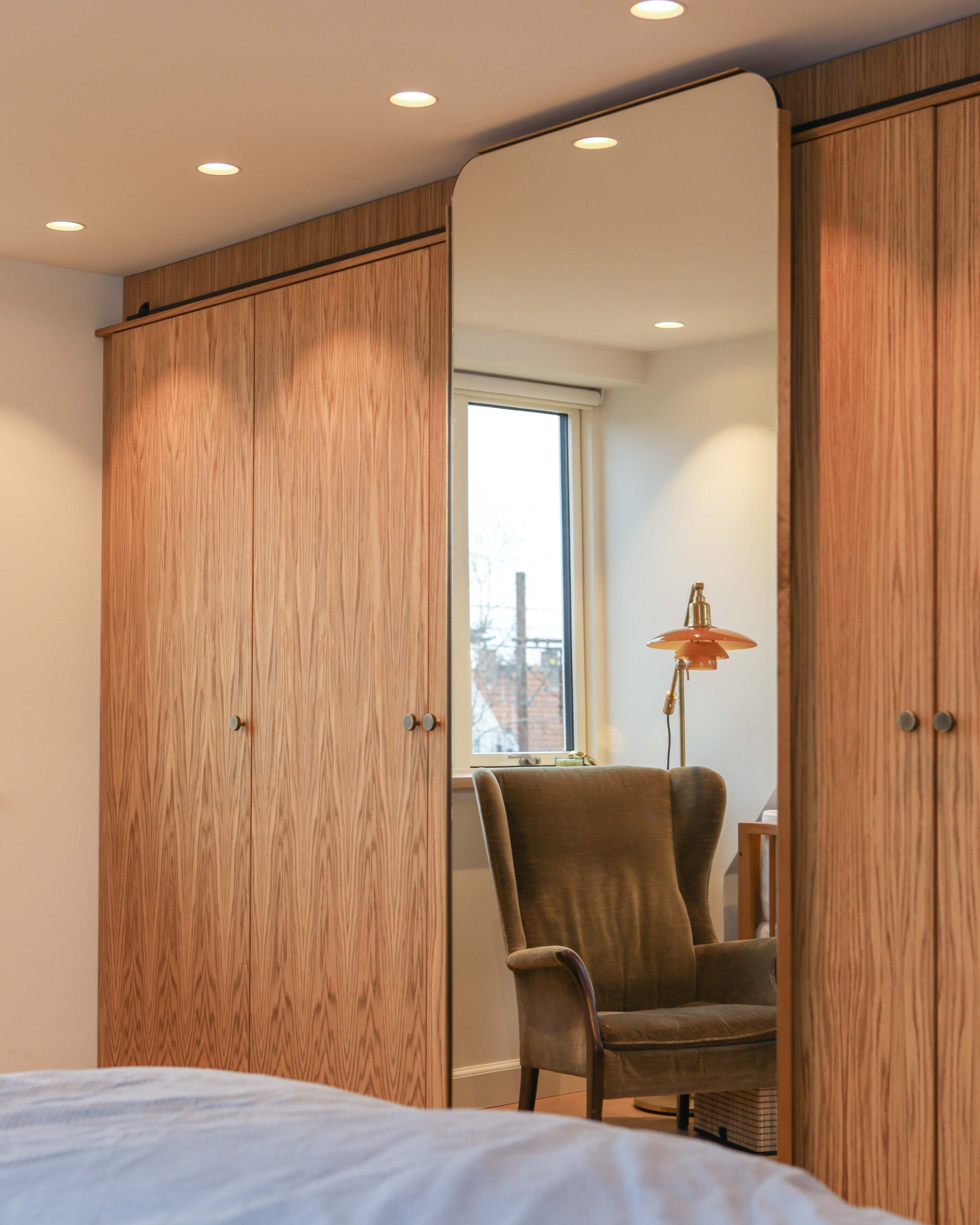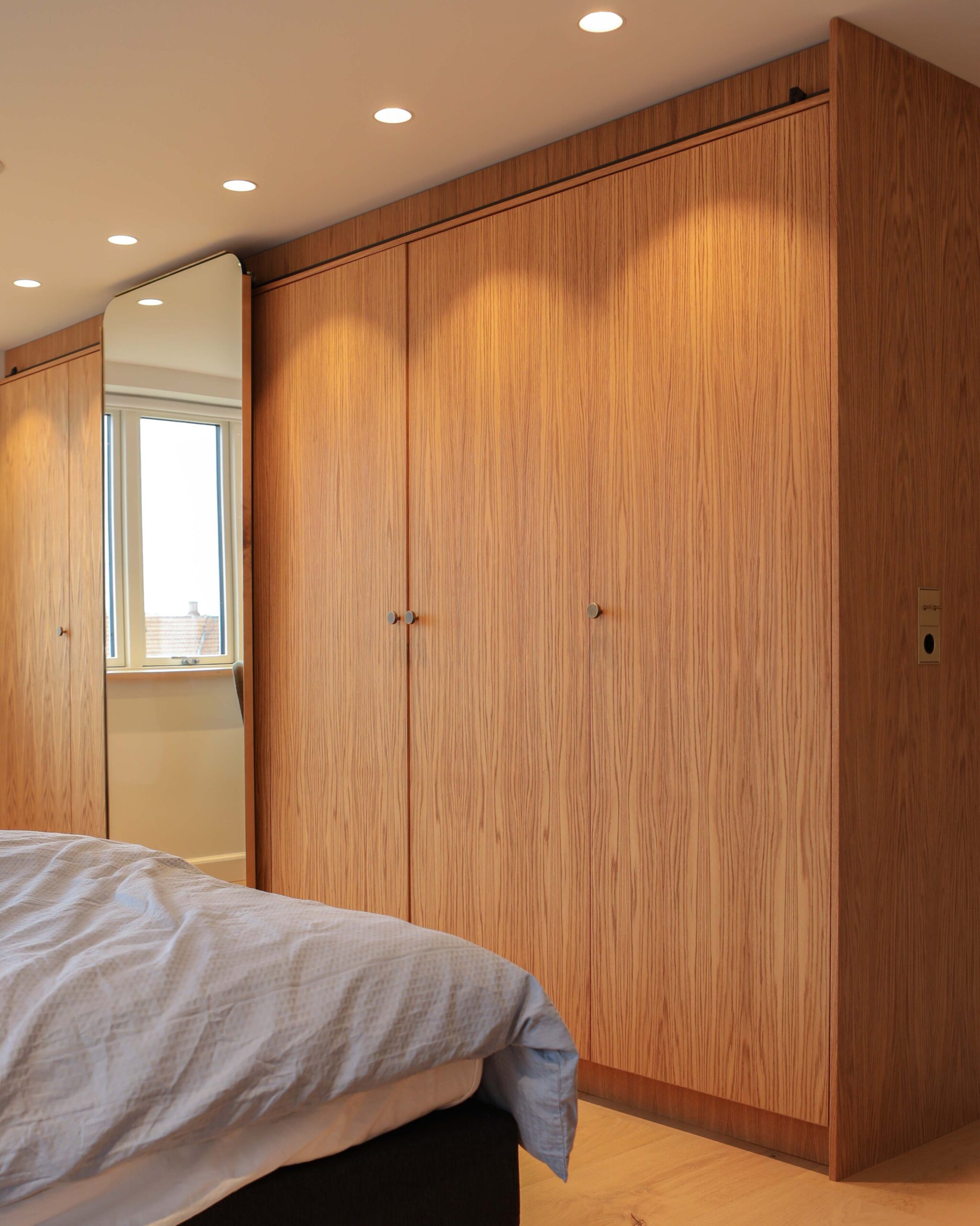 Skræddersyede garderobeløsninger med integreret spejl og naturligt træ