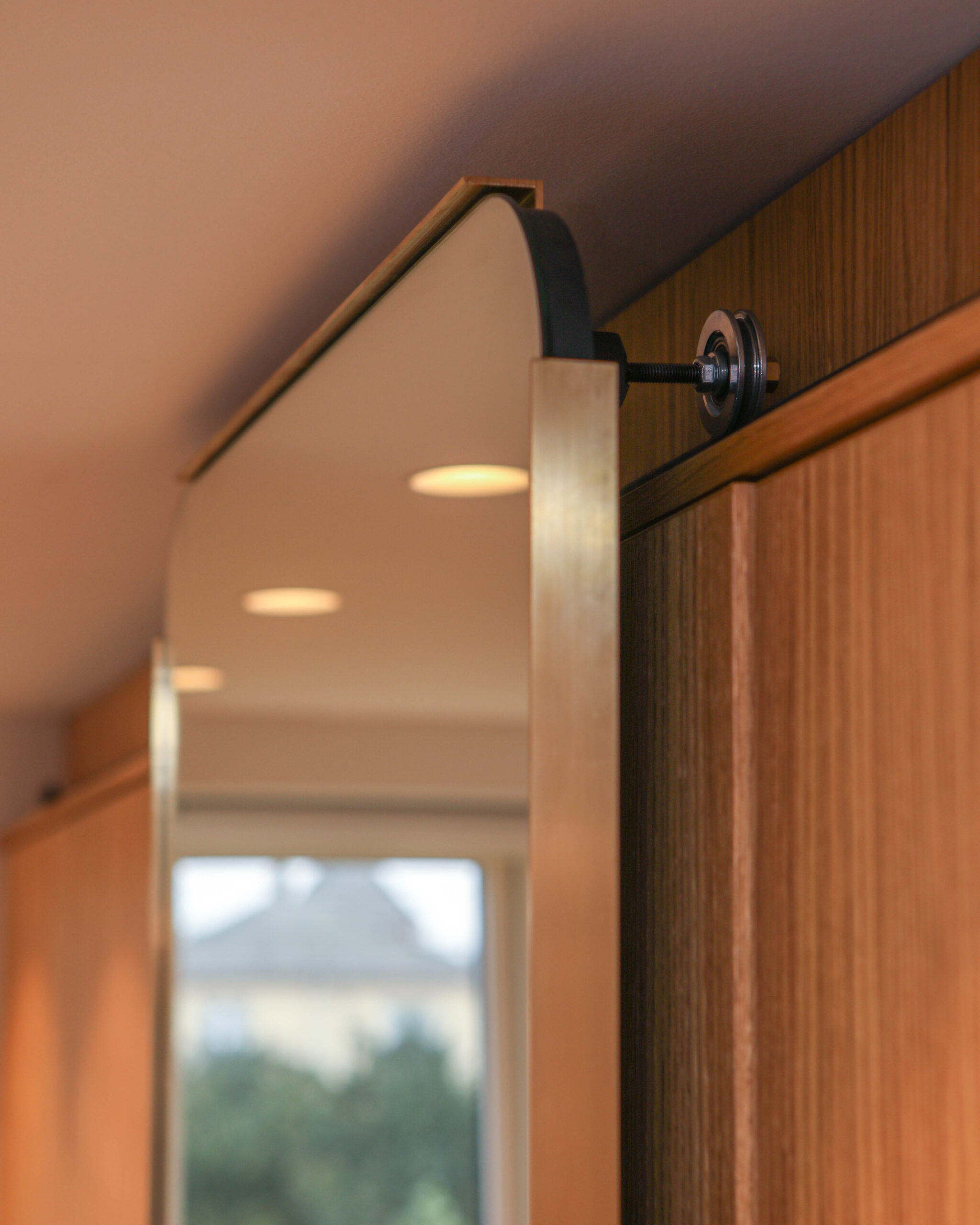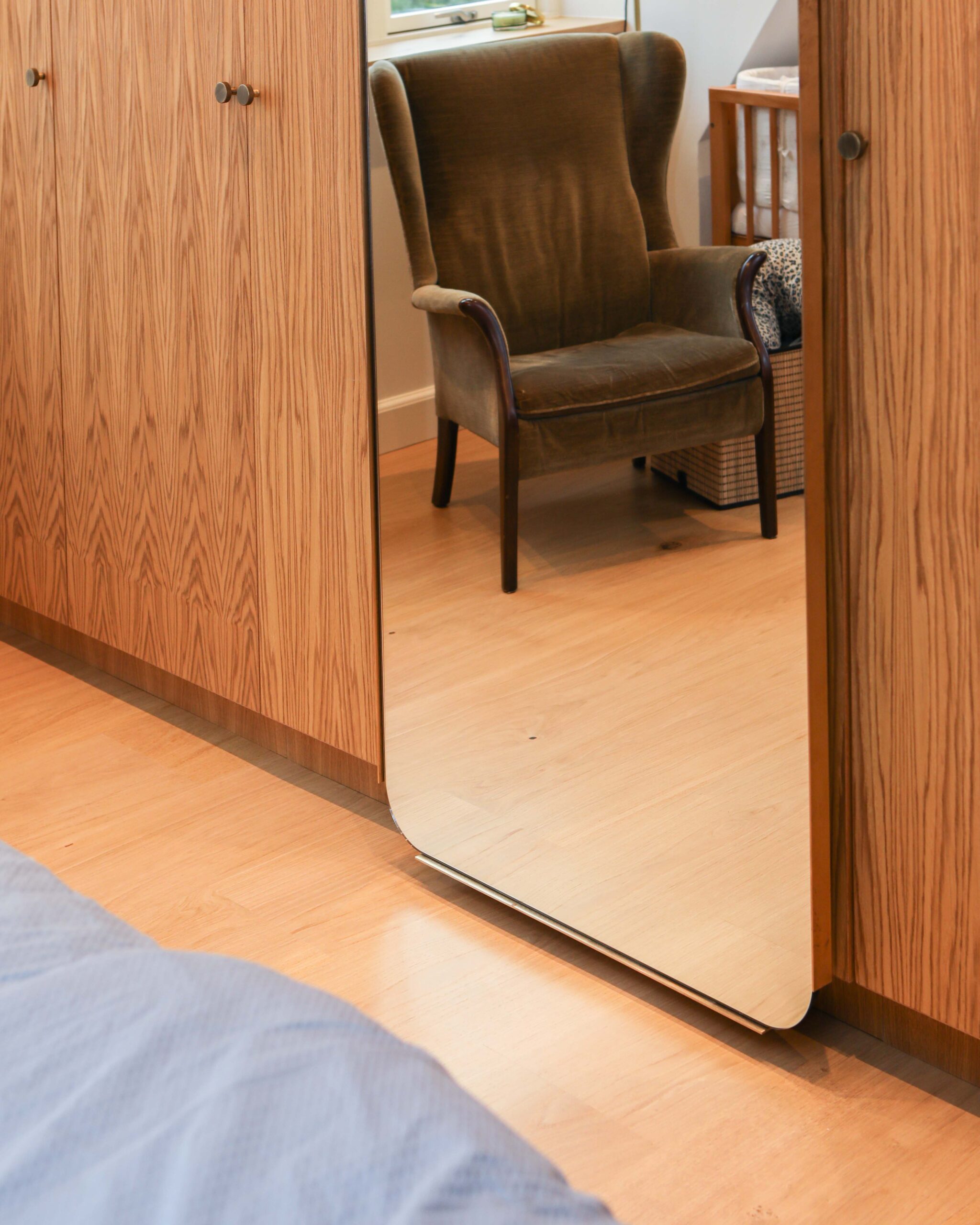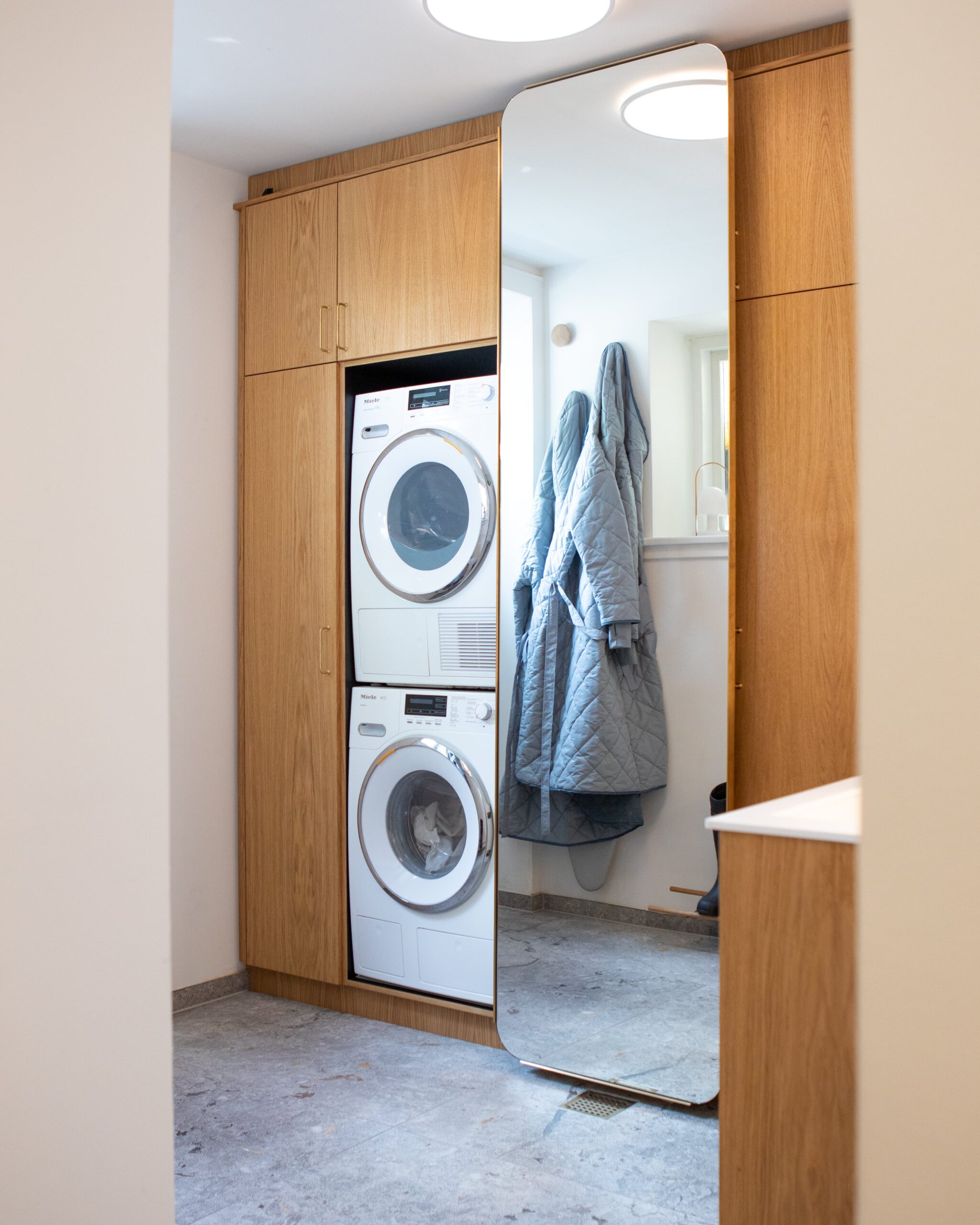 I soveværelset bidrager spejlet til at reflektere dagslyset og skabe en følelse af rummelighed, mens det i bryggerset både fungerer som praktisk helkropsspejl og adgangsløsning til vaskefaciliteterne bagved.