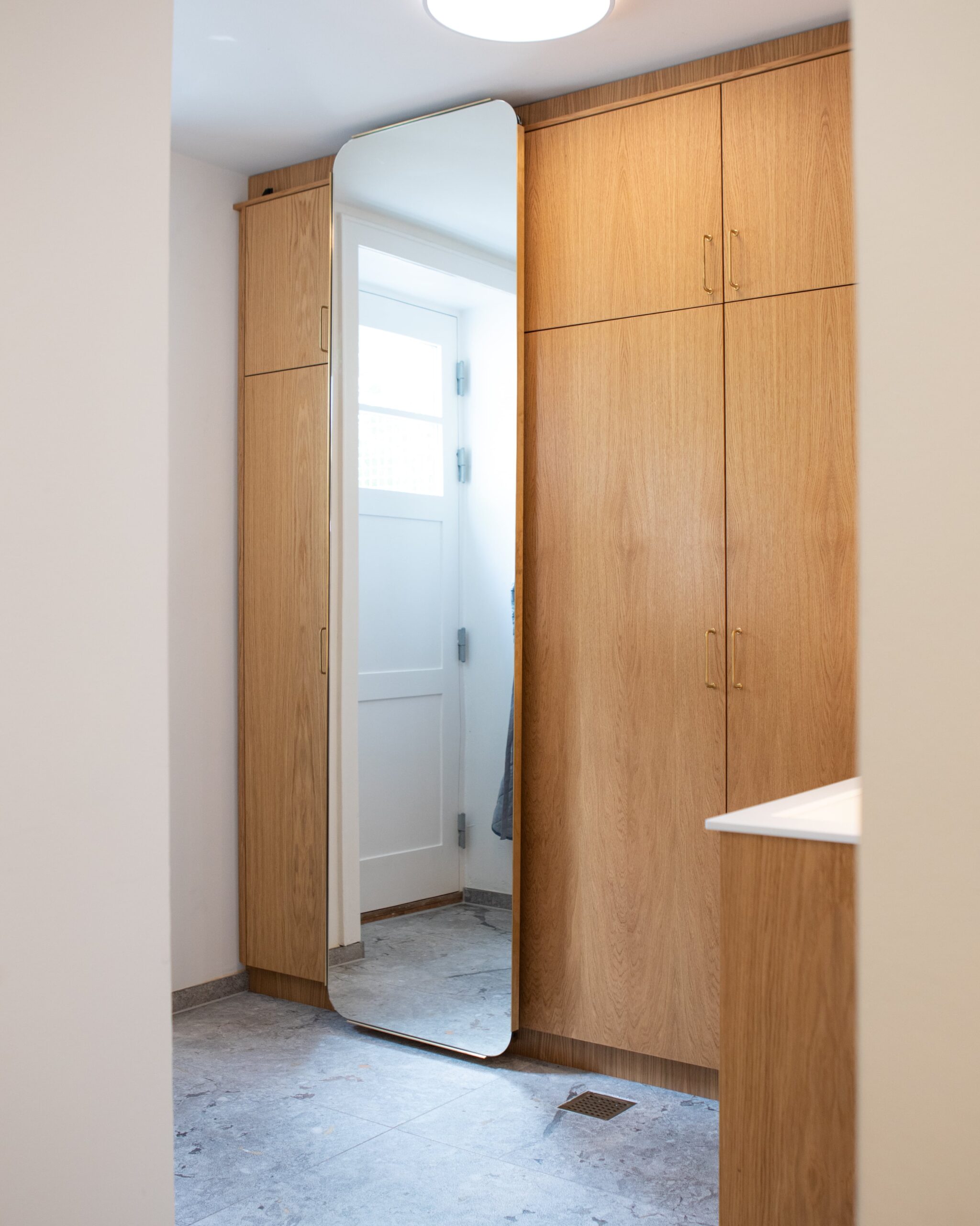 En særlig detalje i løsningen er det store, vertikale spejl, som er monteret på en glideskinne. Spejlet kan let skubbes til siden og giver dermed fleksibilitet og skjuler adgang til ekstra opbevaringsplads eller en vaskesøjle – afhængig af rummet. Den buede afslutning nederst og de afrundede hjørner giver spejlet et eksklusivt og blødt udtryk, som harmonerer med de øvrige materialer.